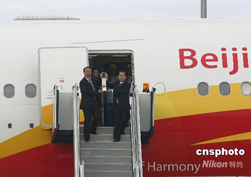 圖為北京奧組委執(zhí)行副主席蔣效愚(左)與中國(guó)駐澳大利亞大使章均賽共同手持圣火燈緩步走下飛機(jī)。作者: 沈晨