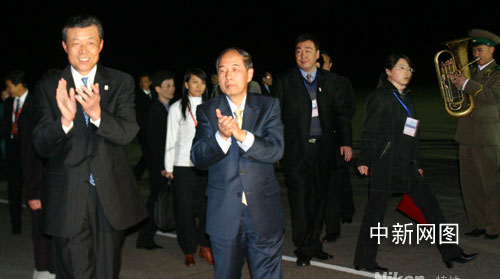 4月28日凌晨0時20分,載有北京奧運圣火的“奧運圣火號”平穩(wěn)地降落在平壤國際機(jī)場。朝鮮首都平壤是北京奧運圣火海外傳遞“和諧之旅”的第18站。這是奧運圣火自一九三六年開始傳遞活動以來,首次來到朝鮮。圖為北京奧組委執(zhí)行副主席李炳華(左二)與中國駐朝鮮大使劉曉明(左)在機(jī)場受到熱烈歡迎。沈晨 攝