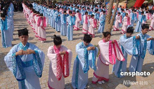 4月27日,福建閩侯縣首屆傳統(tǒng)漢服成年禮活動在福州曇石山博物館舉行,300名中學(xué)生身著傳統(tǒng)漢服出席。整個成年禮儀活動按傳統(tǒng)禮儀進(jìn)行,分為加冠、加笄、成人宣誓、敬師長等環(huán)節(jié),是目前福建規(guī)模最大的傳統(tǒng)漢服成年禮活動。中新社發(fā) 劉可耕 攝