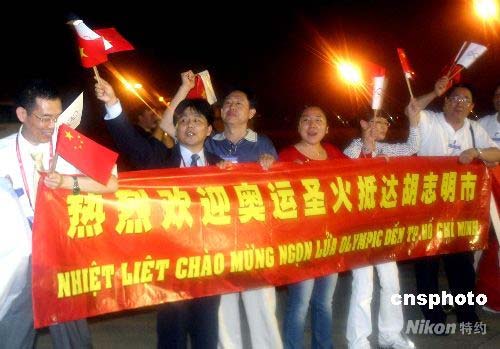 華人華僑在胡志明市國(guó)際機(jī)場(chǎng)歡迎奧運(yùn)圣火到來(lái)。中新社發(fā) 沈晨 攝