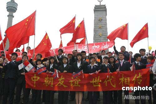 華人華僑、中國(guó)留學(xué)生在中朝友誼塔下舉著“中朝友誼 時(shí)代相傳”的標(biāo)語(yǔ)觀看圣火傳遞。 中新社發(fā) 沈晨 攝