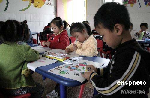 四月二十八日下午,安徽省阜陽(yáng)市振潁幼兒園的學(xué)生在上美術(shù)課。安徽省阜陽(yáng)市千余嬰幼兒童感染腸道病毒EV71后,當(dāng)?shù)卣扇∫磺写胧┘訌?qiáng)救治,嚴(yán)守預(yù)防,減少擴(kuò)延,經(jīng)過有效控制,目前人心安定,社會(huì)各項(xiàng)活動(dòng)有條不紊,小學(xué)、幼兒園學(xué)習(xí)生活如常。中新社發(fā) 張婭子 攝