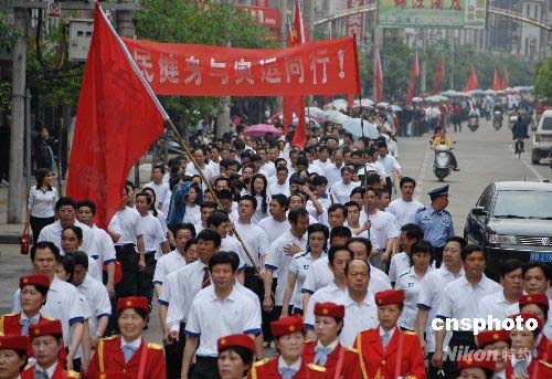 4月30日,南康市民參加健步行。當(dāng)天是北京奧運(yùn)會(huì)倒計(jì)時(shí)100天,江西南康市舉行了“慶五一,迎奧運(yùn),樹新風(fēng),促和諧”職工萬人健步行活動(dòng),慶!拔逡弧眹H勞動(dòng)節(jié),迎接北京奧運(yùn)會(huì)。 中新社發(fā) 許朝陽 攝