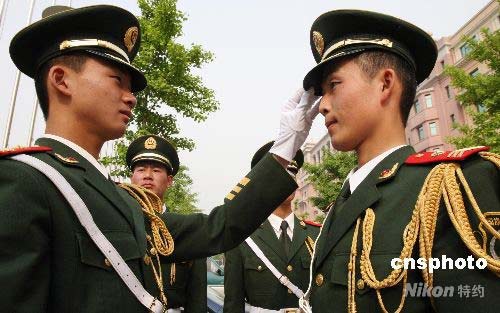4月30日,北京飯店舉行迎奧運倒計時100天千人簽字活動,北京飯店被國際奧委會正式確立為第29屆奧林匹克大家庭總部飯店,隨著2008北京奧運會的臨近,飯店開展了以奧運為目標(biāo)的服務(wù)技能比賽,投入到奧運接待服務(wù)工作中。北京飯店千名員工,以及天安門國旗護衛(wèi)隊、中國人民解放軍軍樂團參加奧運倒計時100天儀式。 圖為在北京飯店奧運倒計時100天儀式上天安門國旗護衛(wèi)隊?wèi)?zhàn)士整理軍容。 中新社發(fā) 錢興強 攝