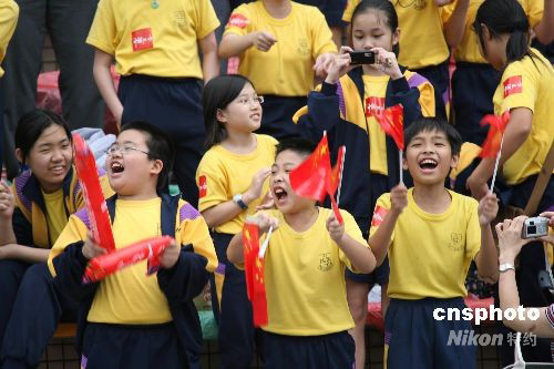 圖為在沙田馬場(chǎng)出席“萬(wàn)眾歡騰迎圣火”大型社區(qū)慶;顒(dòng)的小朋友們。中新社發(fā) 武仲林 攝