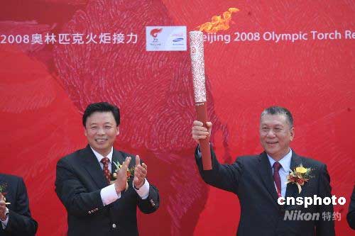 圖為澳門特別行政區(qū)行政長(zhǎng)官何厚鏵(右) 、北京奧組委執(zhí)行副主席楊樹安等出席起跑儀式。中新社發(fā) 武仲林 攝