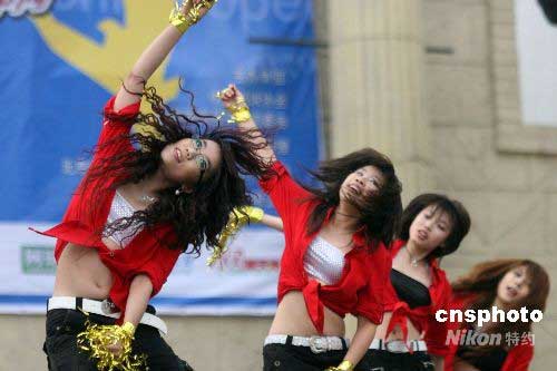 2008年“五一”期間, 2008“中網(wǎng)·網(wǎng)動(dòng)中國”網(wǎng)球拉拉隊(duì)團(tuán)體復(fù)賽在北京歡樂谷舉行。來自北京十幾所高校的拉拉隊(duì)選手參加了比賽,進(jìn)入前三名的選手將取得2008中國網(wǎng)球公開賽拉拉隊(duì)的資格。中新社發(fā) 陳曉根 攝