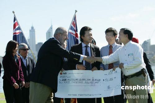 13個西澳華人社團(tuán)的代表向西澳參加北京奧運的運動員捐贈了五萬澳幣(近四十萬人民幣),表達(dá)西澳洲華人對澳大利亞體育事業(yè)的支持。 中新社發(fā) 高周丹 攝