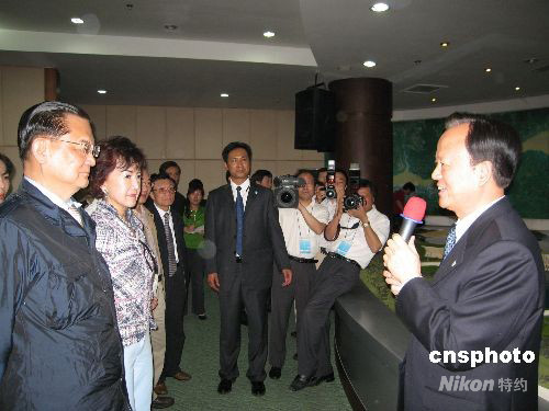 三峽總公司總經(jīng)理李永安向連戰(zhàn)一行介紹三峽工程概況。中新社發(fā) 艾啟平 攝