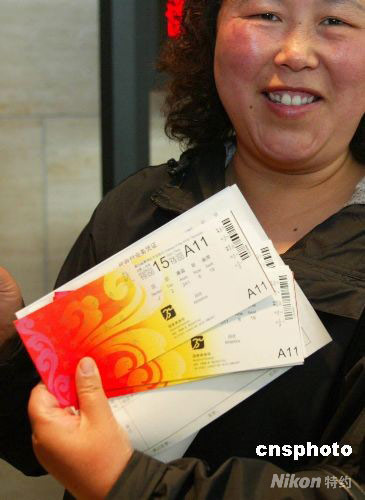 5月5日,北京奧運會第三階段門票銷售正式啟動。由于這一階段采取“先到先得”的售票原則,公眾購票熱情十分高漲。據(jù)奧運票務(wù)中心統(tǒng)計,截至當(dāng)日上午11時40分,男足半決賽和決賽、男子110米欄半決賽、男籃預(yù)賽等8個場次的門票已售罄。第三階段銷售將投放奧運門票138萬張,涵蓋16個大項的244個比賽場次。圖為北京一位民眾買到票后異常高興。 中新社發(fā) 富田 攝