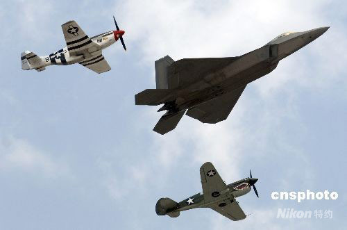 當(dāng)?shù)貢r間5月4日,一架美軍最先進(jìn)的F-22猛禽戰(zhàn)機(jī)(中)與二戰(zhàn)時期的美軍戰(zhàn)機(jī)P-51和P-40空中共舞,讓人們體驗航空科技的突飛猛進(jìn)。當(dāng)天,位于美國南加州河濱縣的一個美國空軍預(yù)備基地舉行規(guī)模盛大的航空展和飛行表演。C-17A全球霸王運輸機(jī)、C-5銀河運輸機(jī)等空中巨無霸和F-22猛禽戰(zhàn)機(jī)等美軍先進(jìn)軍用飛機(jī)亮相展覽,F(xiàn)-22戰(zhàn)機(jī)飛行表演、美國空軍“雷鳥”飛行隊的特技表演等令近十萬民眾大飽眼福。中新社發(fā) 張煒 攝
