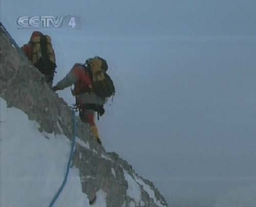 中國登山隊奧運(yùn)圣火登頂珠峰突擊隊8日凌晨向珠峰峰頂發(fā)起沖擊。圖為電視截圖。