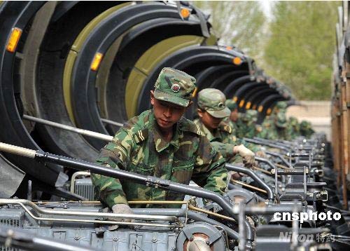 5月7日,常年擔負青藏線運輸任務的解放軍總后勤部青藏兵站部某汽車團官兵在集中檢查保養(yǎng)車輛。 總后勤部青藏兵站部某汽車團,在自然條件惡劣、運輸任務繁重的情況下,連續(xù)多年圓滿完成任務。高原汽車兵是支援西藏的保障部隊,他們穿行"生命禁區(qū)",闖過"死亡地帶",在海拔平均4500多米、2000公里長的青藏線上奔跑著。從1954年第一批青藏兵站官兵挺進雪域高原,到如今已是54年了。54年來,兵站部累計承運各類物資700余萬噸,接待過往人員逾億餐次,收發(fā)各類物資3000多萬噸。先后參加搶險救災百余次,搶救遇險群眾25000多人。中新社發(fā) 吳蘇琳 攝