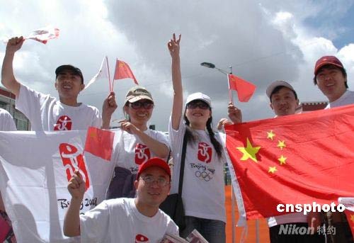 奧運圣火成功登上珠峰后,拉薩街頭一片歡騰,市民歡天喜地奔走相告。中新社發(fā) 周波 攝