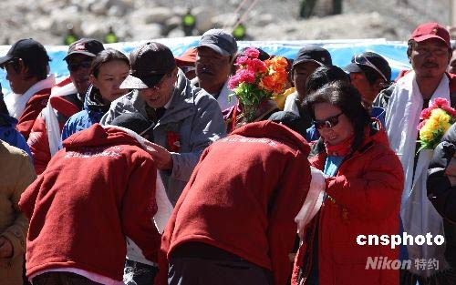 5月10日,北京奧運(yùn)火炬接力珠峰傳遞中國登山隊(duì)凱旋慶祝儀式在珠峰大本營舉行。西藏自治區(qū)政府主席向巴平措(左)、國家體育總局副局長胡家燕等領(lǐng)導(dǎo)出席慶祝儀式并向登珠峰勇士獻(xiàn)上潔白的哈達(dá)。 中新社發(fā) 盛佳鵬 攝