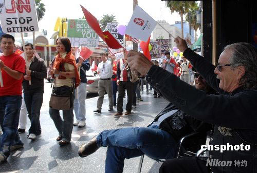 當(dāng)?shù)貢r(shí)間5月10日,通過(guò)網(wǎng)絡(luò)自發(fā)組織的南加州數(shù)百名華人華僑、留學(xué)生在洛杉磯著名的好萊塢星光大道上參加支持北京奧運(yùn)集會(huì)游行活動(dòng)。游行活動(dòng)在歡歌笑語(yǔ)中進(jìn)行,沿途受到一些洛杉磯市民的支持和響應(yīng)。 中新社發(fā) 張煒 攝