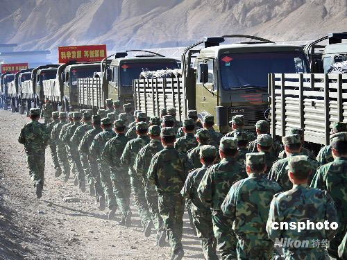 5月10日清晨,赴青藏線執(zhí)行物資運輸任務的中國汽車部隊正規(guī)化出車。中新社發(fā) 吳蘇琳 攝