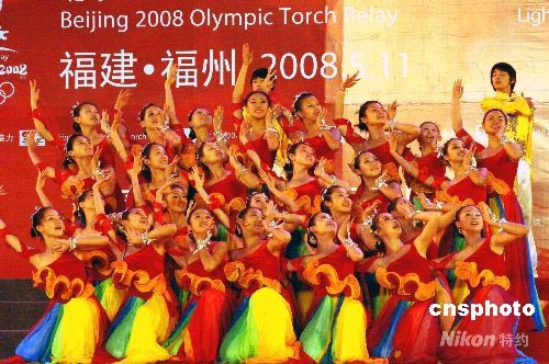 5月11日晚,為慶祝奧運(yùn)圣火福州傳遞圓滿成功,北京奧運(yùn)會火炬接力境內(nèi)傳遞福建福州站慶典儀式文藝晚會在福州望龍臺公園舉行。中新社發(fā) 劉可耕 攝