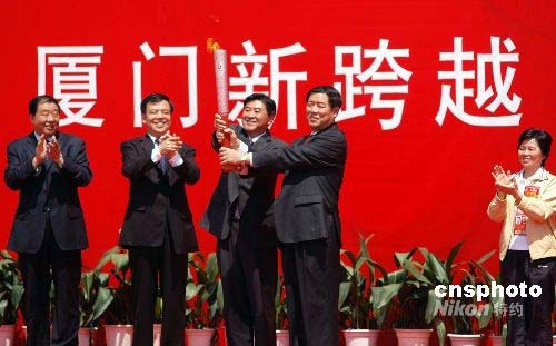 五月十二日下午,奧運圣火在廈門會展中心開始起步傳遞,傳遞路線全長為十七點四公里。圖為廈門市委書記何立峰(右一)從北京奧組委火炬接力中心副主任劉寶杰手中接過“祥云”。
