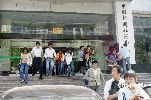 2008年5月12日,河南省會鄭州受到四川地震波及,該市豫博大廈樓內(nèi)跑出的民眾。中新社發(fā) 李志全 攝