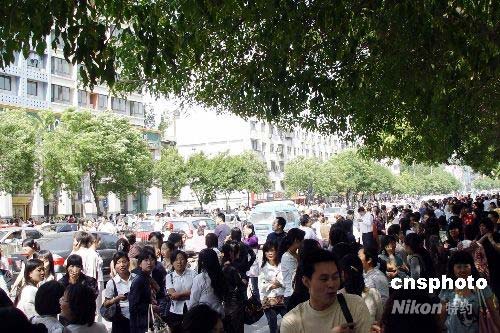 2008年5月12日下午,河南省會(huì)鄭州受到四川地震波及,該市農(nóng)業(yè)路上站滿了疏散的市民。中新社發(fā) 李志全 攝