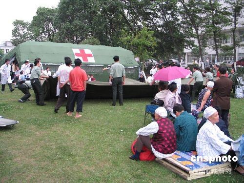 四川汶川縣發(fā)生7.8級地震。成都受到波及,也發(fā)生5.4級地震。位于成都北郊的成都軍區(qū)總醫(yī)院接收了來自地震災區(qū)的100多名傷員。在積極組織搶救的同時,醫(yī)院搭建10余頂大型帳篷,將住院的1000多名患者全部安全轉移。中新社發(fā) 朱琥 攝