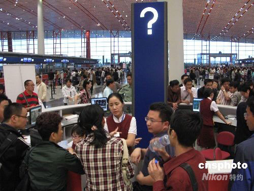 5月12日四川汶川的大地震,造成成都航線停飛,重慶航線臨時中斷,乘客紛紛到首都機場問訊處打探航班消息。 中新社發(fā) 鄒憲 攝