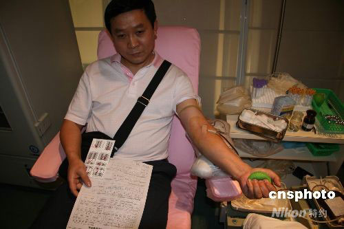 5月12日晚7時(shí)許至13日凌晨,數(shù)千成都市民前往市內(nèi)各獻(xiàn)血點(diǎn)獻(xiàn)血,為四川地震災(zāi)區(qū)的人們獻(xiàn)上愛(ài)心。圖為田先生在林蔭街武侯愛(ài)心獻(xiàn)血屋獻(xiàn)血。 中新社發(fā) 楊杰 攝