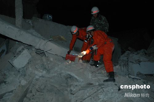 12日下午2:30左右,受四川汶川地震波及,重慶市梁平縣文化鎮(zhèn)一小學(xué)教學(xué)樓發(fā)生垮塌。13日凌晨1時(shí)許,記者從梁平縣政府辦公室獲悉,目前搜救工作已全部結(jié)束,垮塌造成5人死亡,36人受傷。圖為消防人員正利用生命探測器對廢墟下的傷員進(jìn)行探測。 中新社發(fā) 郭虹 攝