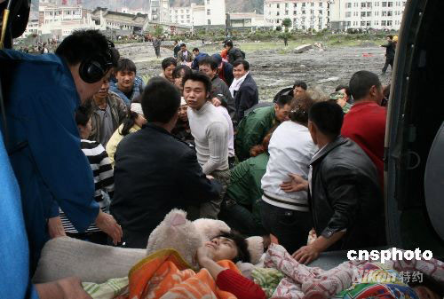 汶川首批40名重傷員被直升機運往成都救治