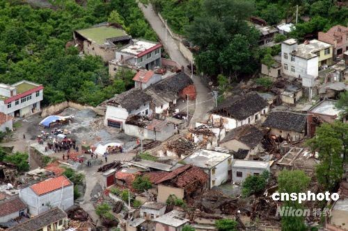 5月14日,空中拍攝的汶川縣城一角。成都軍區(qū)某陸航團(tuán)四架直升機(jī)滿載帳篷、礦泉水等災(zāi)區(qū)急需物資抵達(dá)四川大地震震中汶川縣,并在返回時(shí)將第一批40名重傷員隨機(jī)送抵成都的醫(yī)院救治。中新社發(fā) 張雷 黃龍 攝