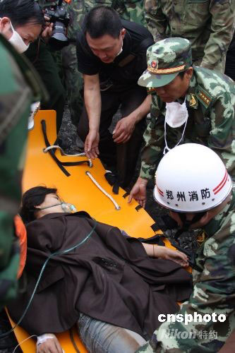 5月14日,在四川什邡市鎣華鎮(zhèn)救災(zāi)的武警鄭州消防支隊(duì)100多名官兵,用7個小時救出一名被廢墟掩埋了3天的工人。