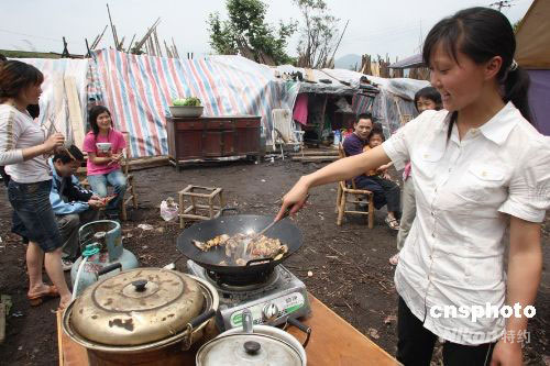在四川大地震中幸存下來的災(zāi)民目前生活基本穩(wěn)定,圖為5月14日,什邡市洛水鎮(zhèn)民眾在臨時(shí)住所旁作飯。