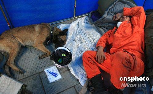 搜救員和搜救犬極度疲勞。中新社發(fā) 周青先 攝