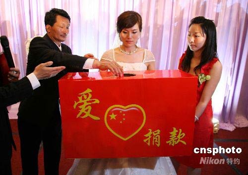 新娘邱媛媛和新郎饒新的家人在婚禮現(xiàn)場(chǎng)向四川災(zāi)區(qū)捐贈(zèng)2萬元人民幣。中新社發(fā) 鐘山 攝