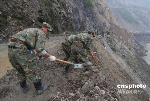 武警在搶修到汶川縣映秀鎮(zhèn)的公路。中新社發(fā) 郭國(guó)權(quán) 攝