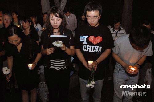當(dāng)?shù)貢r(shí)間五月十六日晚,洛杉磯中國(guó)留學(xué)生和學(xué)者等兩百多人在加州大學(xué)洛杉磯分校舉行燭光追思會(huì),悼念四川大地震死難同胞,并向?yàn)?zāi)區(qū)捐獻(xiàn)愛(ài)心。中新社發(fā) 張煒 攝