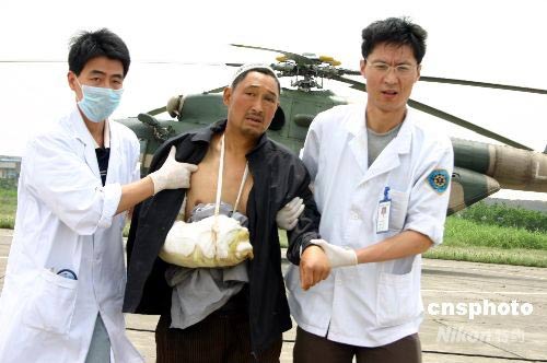 5月18日11時(shí)35分,一架軍用直升機(jī)載著11名臺(tái)灣游客,從四川汶川起飛,于12時(shí)許平安抵達(dá)成都鳳凰山機(jī)場(chǎng)。他們是臺(tái)灣祥鶴旅行社14人游客團(tuán)中脫困的首批游客,另3人將于下午搭乘另一架直升機(jī)脫離險(xiǎn)境。圖為救護(hù)人員攙扶臺(tái)灣游客上車(chē)。中新社發(fā) 楊杰 攝