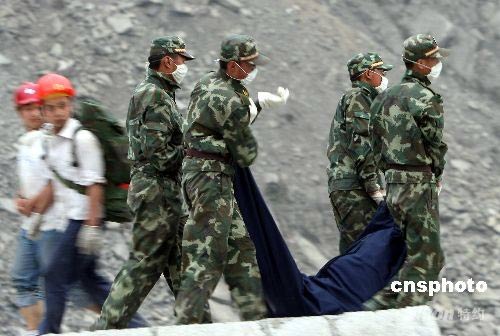 通往四川省汶川地震核心重災(zāi)區(qū)映秀鎮(zhèn)的簡易公路5月17日打通后,各路專業(yè)救援隊繼續(xù)在廢墟中尋找可能的幸存者,部分解放軍與武警士兵則負(fù)責(zé)安置遇難者的遺體,以防止發(fā)生疫情。中新社發(fā) 任晨鳴 攝