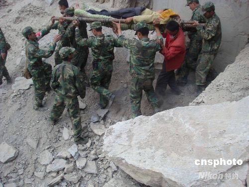 5月18日,成都軍區(qū)駐渝某集團(tuán)軍紅軍師步兵團(tuán)在汶川大地震茂縣懸崖峭壁的羌寨,冒著余震塌方解救兩位女傷員,傍晚成功送到前來支援的解放軍第二軍醫(yī)大學(xué)醫(yī)療隊。中新社發(fā) 賈國榮 攝