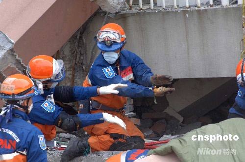 5月18日,日本國際救援隊一行二十余人到達中國四川北川地震現(xiàn)場——北川中學,利用國際先進的探測儀器與中國兩支救援隊分別挖掘廢墟,救援受難學生。經(jīng)過共同探測,在沉入地下的樓層內發(fā)現(xiàn)有三個生物體存在,但挖掘極為危險和困難,生者生命渺茫。圖為日本小隊在工作中。中新社發(fā) 鄒憲 攝