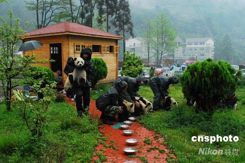 四川發(fā)生大地震后,臥龍保護區(qū)管理局的職工于第一時間將大熊貓轉(zhuǎn)移到安全地帶。在此次地震中,臥龍保護區(qū)管理局的房舍嚴重受損,其中32套大熊貓圈舍中有14套全部損毀,其余嚴重受損。據(jù)悉,工作人員目前正在尋找二到三只下落不明的大熊貓,其余所有熊貓被集中飼養(yǎng)在簡單修復的圈舍中,但圈舍比較擁擠。國家林業(yè)局和四川省林業(yè)廳已緊急調(diào)撥熊貓食品、藥品,以及保護區(qū)內(nèi)職工急需的帳篷等救援物資,現(xiàn)已繞道送至臥龍自然保護區(qū)。中新社發(fā) 臥龍 攝