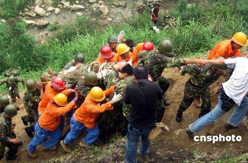 16日上午,師政治部主任高鵬帶領(lǐng)救援突擊隊(duì)和醫(yī)療小分隊(duì)172人,從綿竹市漢旺鎮(zhèn)出發(fā)向重災(zāi)區(qū)天池鄉(xiāng)幾個(gè)村里運(yùn)送救援物資,幫助群眾撤離震區(qū)。11時(shí)左右,當(dāng)部隊(duì)行至高橋以西500米處,突然發(fā)生余震,導(dǎo)致大量山石從山頂傾斜而下,直接威脅著正在這個(gè)路段通過的群眾。作訓(xùn)參謀祝紅杰突然發(fā)現(xiàn)一個(gè)孩子癱倒在石堆上,急忙上前搶抱他,孩子得救了,祝紅杰卻被亂石砸斷左腿,當(dāng)場倒地。作訓(xùn)參謀胡國才眼見一塊亂石砸向老人,極力將老人推到一邊,自己的頭部卻被亂石砸傷暈倒在地。同時(shí),該團(tuán)還有一名司務(wù)長和兩名戰(zhàn)士在救援中被泥石流砸傷…… 看到解放軍為救災(zāi)區(qū)群眾身負(fù)重傷,在現(xiàn)場的一些救災(zāi)志愿者迅即投入搶救部隊(duì)官兵的行動(dòng)中。運(yùn)送途中山路險(xiǎn)峻,他們拉一把、推一把,爭先恐后出把力氣。擔(dān)負(fù)救援撤離群眾任務(wù)的重慶市高新區(qū)人民醫(yī)院的醫(yī)護(hù)人員聞?dòng)嵑螅贿吜髦鵁釡I,一邊實(shí)施現(xiàn)場救護(hù),為他們贏得了寶貴的救治時(shí)機(jī)……