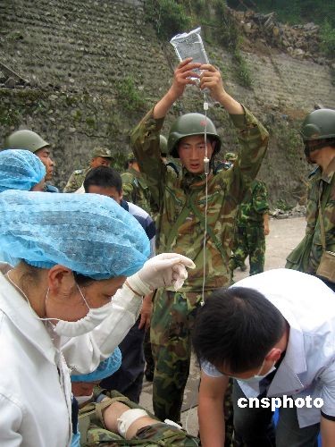 16日上午,師政治部主任高鵬帶領(lǐng)救援突擊隊(duì)和醫(yī)療小分隊(duì)172人,從綿竹市漢旺鎮(zhèn)出發(fā)向重災(zāi)區(qū)天池鄉(xiāng)幾個(gè)村里運(yùn)送救援物資,幫助群眾撤離震區(qū)。11時(shí)左右,當(dāng)部隊(duì)行至高橋以西500米處,突然發(fā)生余震,導(dǎo)致大量山石從山頂傾斜而下,直接威脅著正在這個(gè)路段通過(guò)的群眾。作訓(xùn)參謀祝紅杰突然發(fā)現(xiàn)一個(gè)孩子癱倒在石堆上,急忙上前搶抱他,孩子得救了,祝紅杰卻被亂石砸斷左腿,當(dāng)場(chǎng)倒地。作訓(xùn)參謀胡國(guó)才眼見(jiàn)一塊亂石砸向老人,極力將老人推到一邊,自己的頭部卻被亂石砸傷暈倒在地。同時(shí),該團(tuán)還有一名司務(wù)長(zhǎng)和兩名戰(zhàn)士在救援中被泥石流砸傷…… 看到解放軍為救災(zāi)區(qū)群眾身負(fù)重傷,在現(xiàn)場(chǎng)的一些救災(zāi)志愿者迅即投入搶救部隊(duì)官兵的行動(dòng)中。運(yùn)送途中山路險(xiǎn)峻,他們拉一把、推一把,爭(zhēng)先恐后出把力氣。擔(dān)負(fù)救援撤離群眾任務(wù)的重慶市高新區(qū)人民醫(yī)院的醫(yī)護(hù)人員聞?dòng)嵑,一邊流著熱淚,一邊實(shí)施現(xiàn)場(chǎng)救護(hù),為他們贏得了寶貴的救治時(shí)機(jī)……