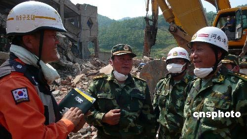 5月19日,中韓兩國救援隊員四川什邡鎣華鎮(zhèn)一處樓房廢墟上,聯(lián)手搜救被困者。中新社發(fā) 張曉理 攝