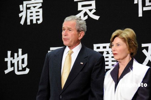 美國總統(tǒng)布什二十日一早來到中國駐美大使館,悼念中國四川大地震遇難者。圖為布什夫婦在周文重大使夫婦陪同下在中國大使館向地震遇難者默哀。中新社發(fā) 邱江波 攝