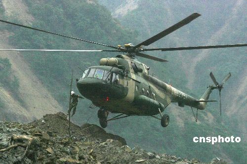五月二十日是汶川大地震第九天,成都軍區(qū)陸航團(tuán)姜廣偉王牌直升機(jī)組上午十時成功以單輪強(qiáng)降北川重災(zāi)區(qū)“定時炸彈”——堰塞湖無名塌方小土堆上,緊急運(yùn)送水利地質(zhì)技術(shù)隊(duì)實(shí)地監(jiān)測水位上漲危情。一座大山的崩塌堵塞河道形成危險的堰塞湖,如果潰堤將危及北川全縣和綿陽災(zāi)區(qū)。中新社發(fā) 賈國榮 攝