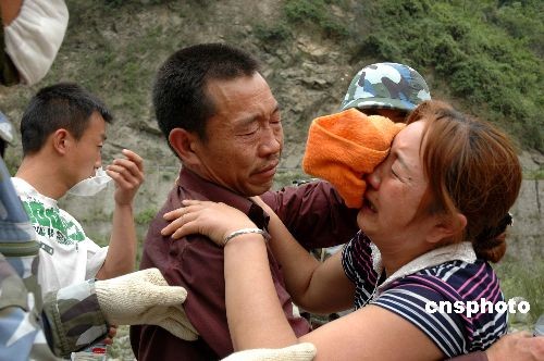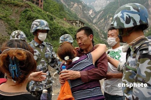 5月19日上午,100多名海軍陸戰(zhàn)隊(duì)員深入險(xiǎn)境,克服重重險(xiǎn)阻,將被困深山7天的礦工黃云躍解救出來(lái),與妻子相見(jiàn)。夫妻重逢后相擁痛哭。李唐 攝