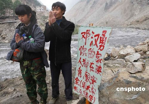 5月17日上午,在四川省汶川大地震中幸存的49歲映秀鎮(zhèn)頭道村農(nóng)民鄧云祥和女兒鄧小琴,在通往家鄉(xiāng)的必經(jīng)之地插上告示牌,企望失蹤的兒子鄧漢勇能夠平安歸來(lái)。任晨鳴 攝