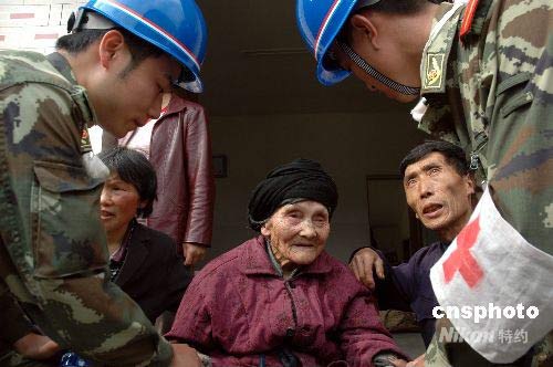 5月21日,在四川平武縣平通鎮(zhèn)大松村抗震救災的廣安武警成功將一位百歲老人解救下山。當日,在四川汶川大地震重災區(qū)四川平武縣平通鎮(zhèn)抗震救災的武警廣安市支隊李林麒等20名官兵,徒步翻山越嶺來到海拔1600多米高的大松村,奮戰(zhàn)3個多小時,成功將一位30年沒有下過山、雙目失明的百歲老人李孝珍解救下山。中新社發(fā) 邱海鷹 攝